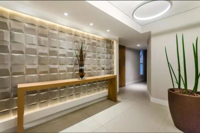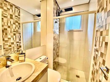 Banheiro totalmente revestido em porcelanato com planejado e box de vidro