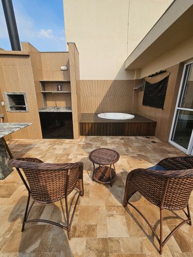 No pavimento superior, um ambiente versátil pode ser adaptado como sala de TV, home office ou lounge, com lavabo de apoio. O terraço gourmet é um dos grandes diferenciais: equipado com churrasqueira, pia e lavanderia, é o cenário ideal para receber amigos e familiares com conforto e privacidade. A planta é ampla, inteligente e muito bem aproveitada, oferecendo ótimo potencial de personalização para quem valoriza estilo e funcionalidade.