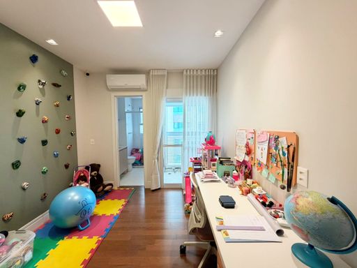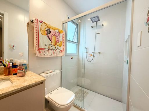 🟢 A área de convivência merece destaque especial: uma charmosa área gourmet com churrasqueira e pé-direito duplo, ideal para receber convidados com conforto e estilo, integrada às varandas fechadas em vidro, que ampliam a experiência de convivência e contemplação.