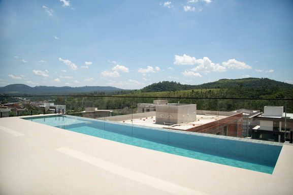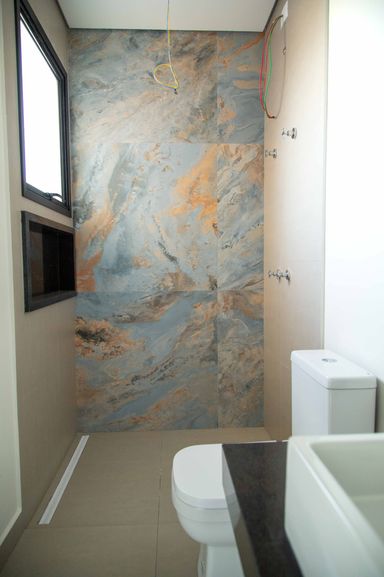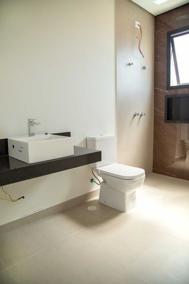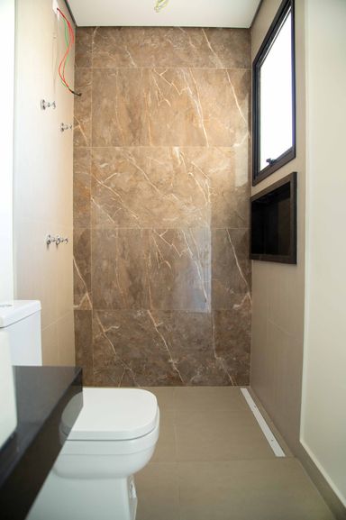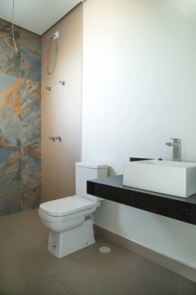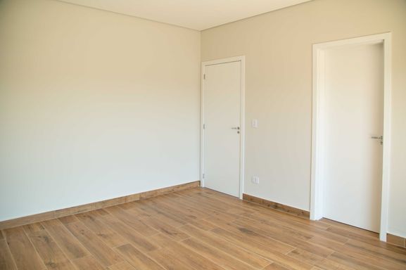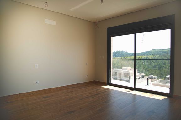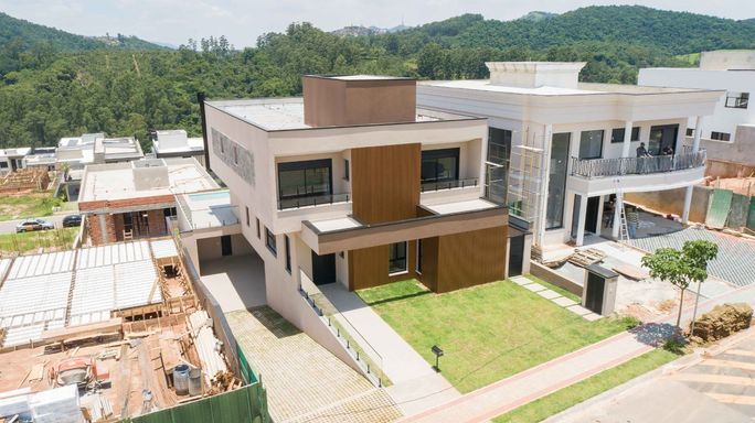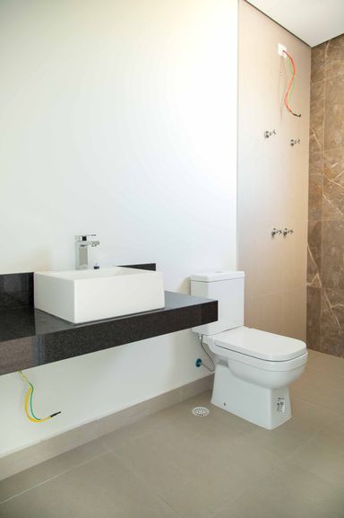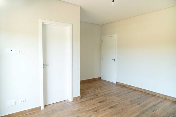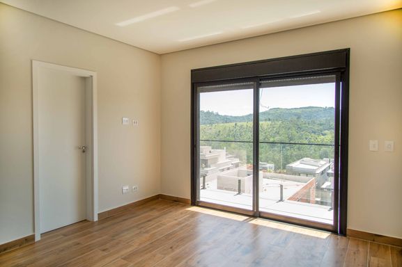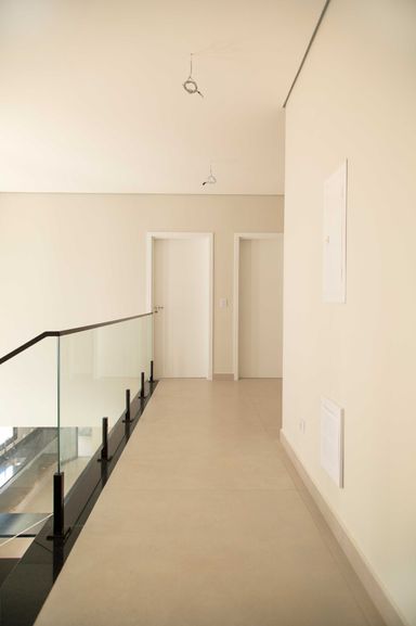 No pavimento superior, um hall íntimo distribui o acesso às quatro amplas suítes com closet e varanda, incluindo uma super suíte master que se destaca pelo conforto e pela sofisticação. Todas as suítes são equipadas com persianas blackout automatizadas e contam com infraestrutura completa de tubulações para gás, elétrica e drenagem, preparadas para instalação de ar-condicionado e aquecedores de ambiente. Os banheiros possuem infraestrutura para aquecimento de água a gás ou elétrico, sendo todo o fornecimento de gás da residência realizado pela COMGÁS, assegurando eficiência e segurança.