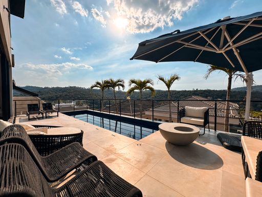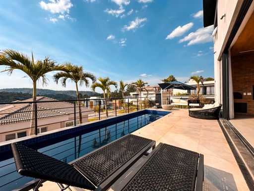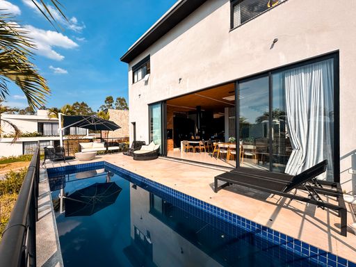 Casa de esquina / Totalmente mobiliada / 442 m² de terreno / 347 m² de área construída / 4 suítes / 2 closets + 1 camarim / sala com 3 ambientes integrados / Piscina privativa / area gourmet com churrasqueira / lareira / adega / armários embutidos / aspiração central / dependência de serviço / depósito / 4 vagas de garagem.