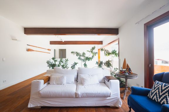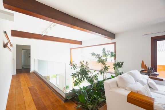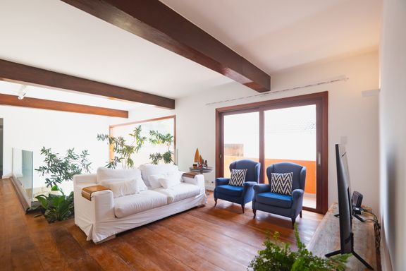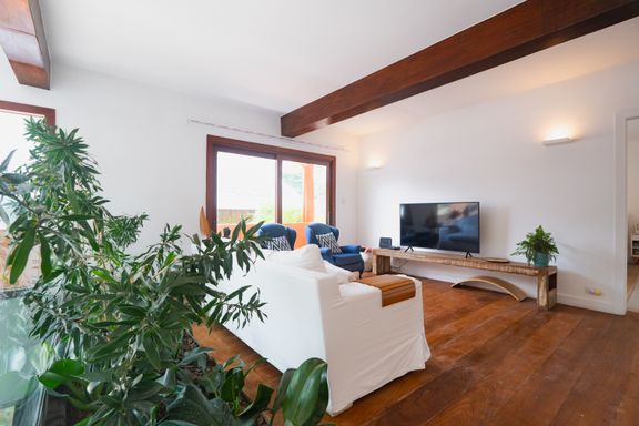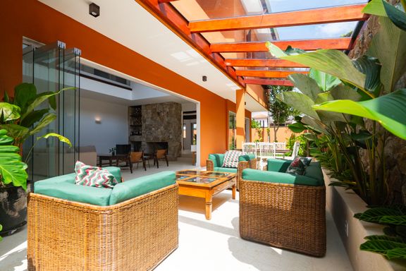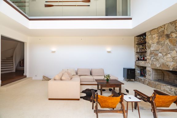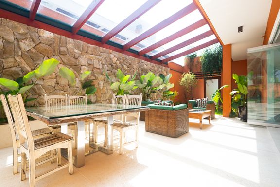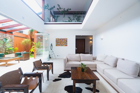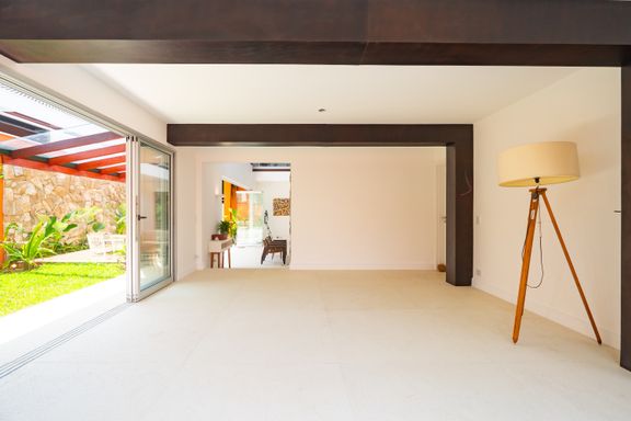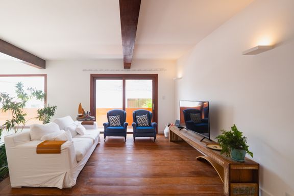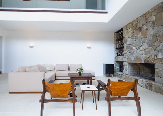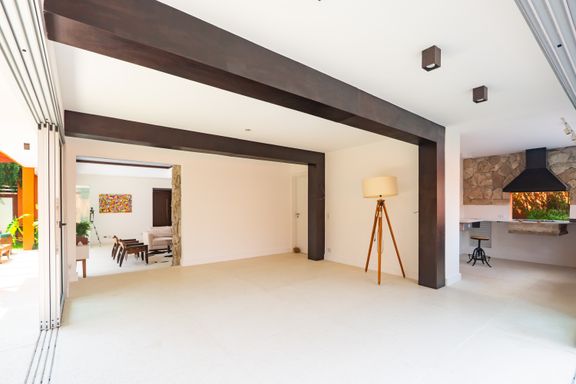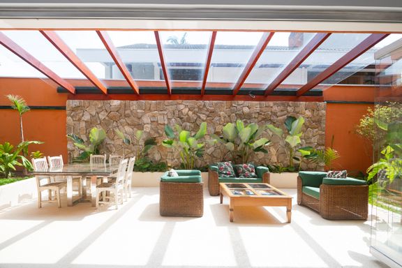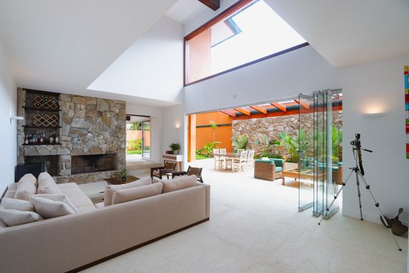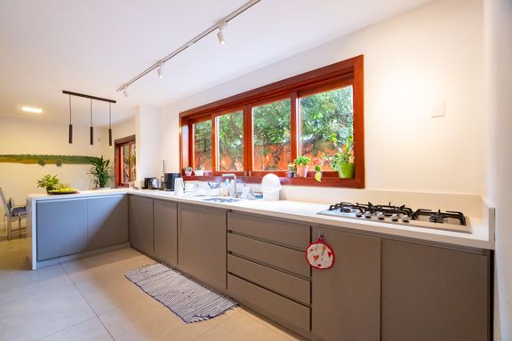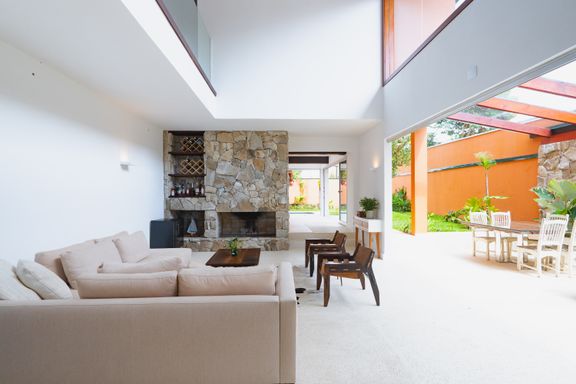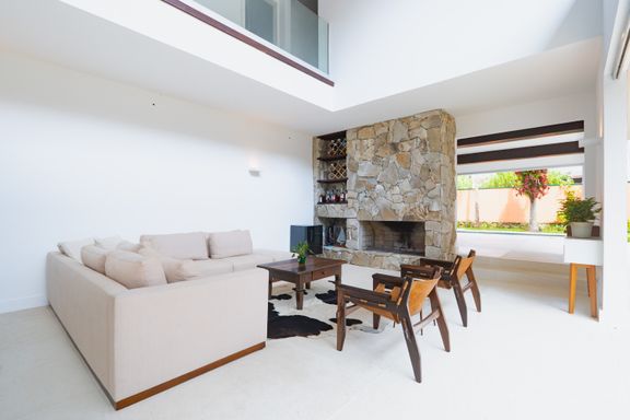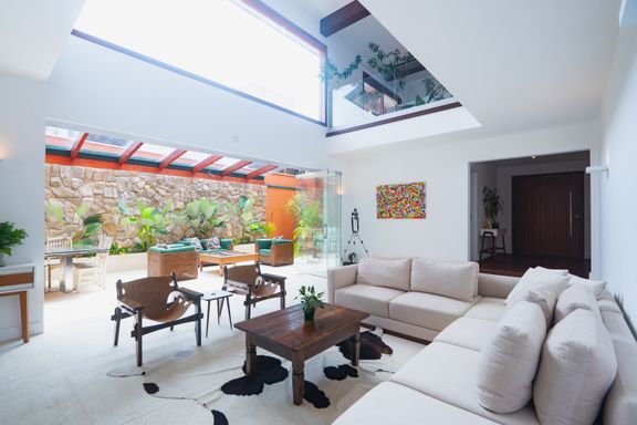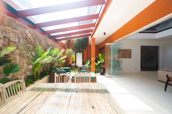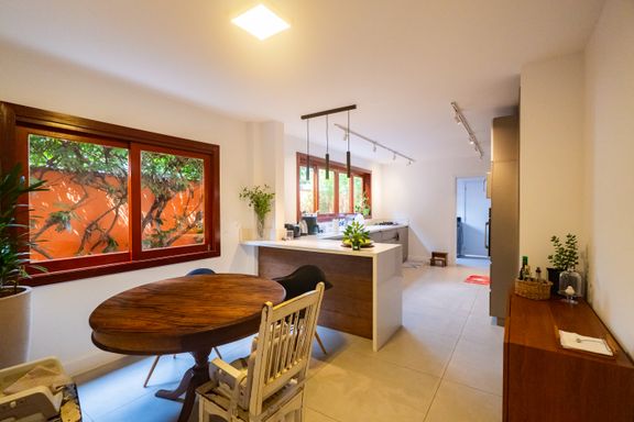 ● Sala de estar e jantar integradas com pé-direito duplo e iluminação natural