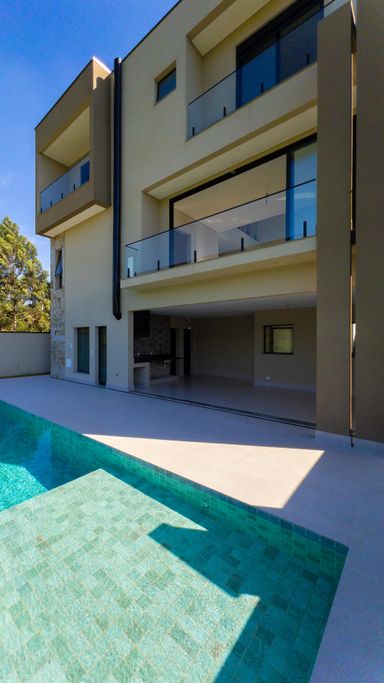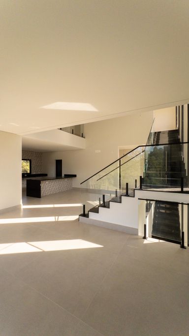 A casa oferece ambientes amplos e integrados, área gourmet com churrasqueira, sauna, deck de sol e piscina com prainha, além de salão de jogos e suíte para hóspedes. São 4 suítes com closet e varanda, incluindo uma super suíte master, todas com persianas blackout automatizadas e infraestrutura completa para ar-condicionado e aquecimento de água a gás ou elétrico. Garagem para 6 veículos, infraestrutura pronta e um cenário único de tranquilidade junto à natureza.