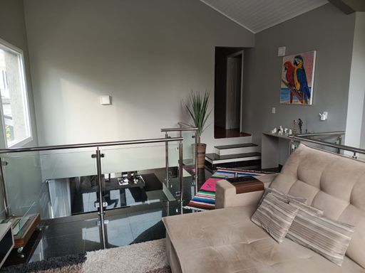 Inter Andares. Sala de TV ampla, aconchegante e integrada com projeto arquitetônico, guarda corpo em inox e vidros, a sala de TV fica em posição de Inter andares.