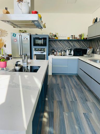 A escada flutuante conduz ao salão gourmet, verdadeiro coração da casa — com cozinha completa, espaço de jantar, sala de TV e aberturas amplas em vidro e alumínio, que conectam interior e exterior de forma fluida e elegante.