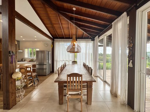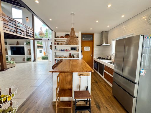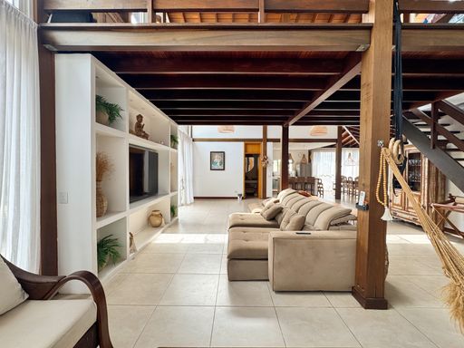 O imóvel conta com aproximadamente 500 m² de área construída, distribuídos em três casas. Casa principal com conceito aberto, boa ventilação natural, 3 suítes, mezanino, sala para três ambientes, sala de jantar, cozinha integrada, lavabo, despensa, lavanderia e hall de entrada; Apartamento para hóspedes com sala, cozinha e dois quartos; Terceira casa/salão, que pode ser usada como salão de festas ou espaço multiuso, com cozinha, salas e banheiros. No total, o imóvel conta com 3 suítes e 5 quartos com banheiros externos.