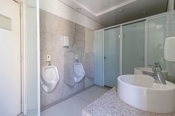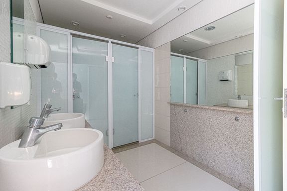 🟢 2 banheiros por laje (masculino e feminino) localizados na área comum do andar (padrão corporativo).